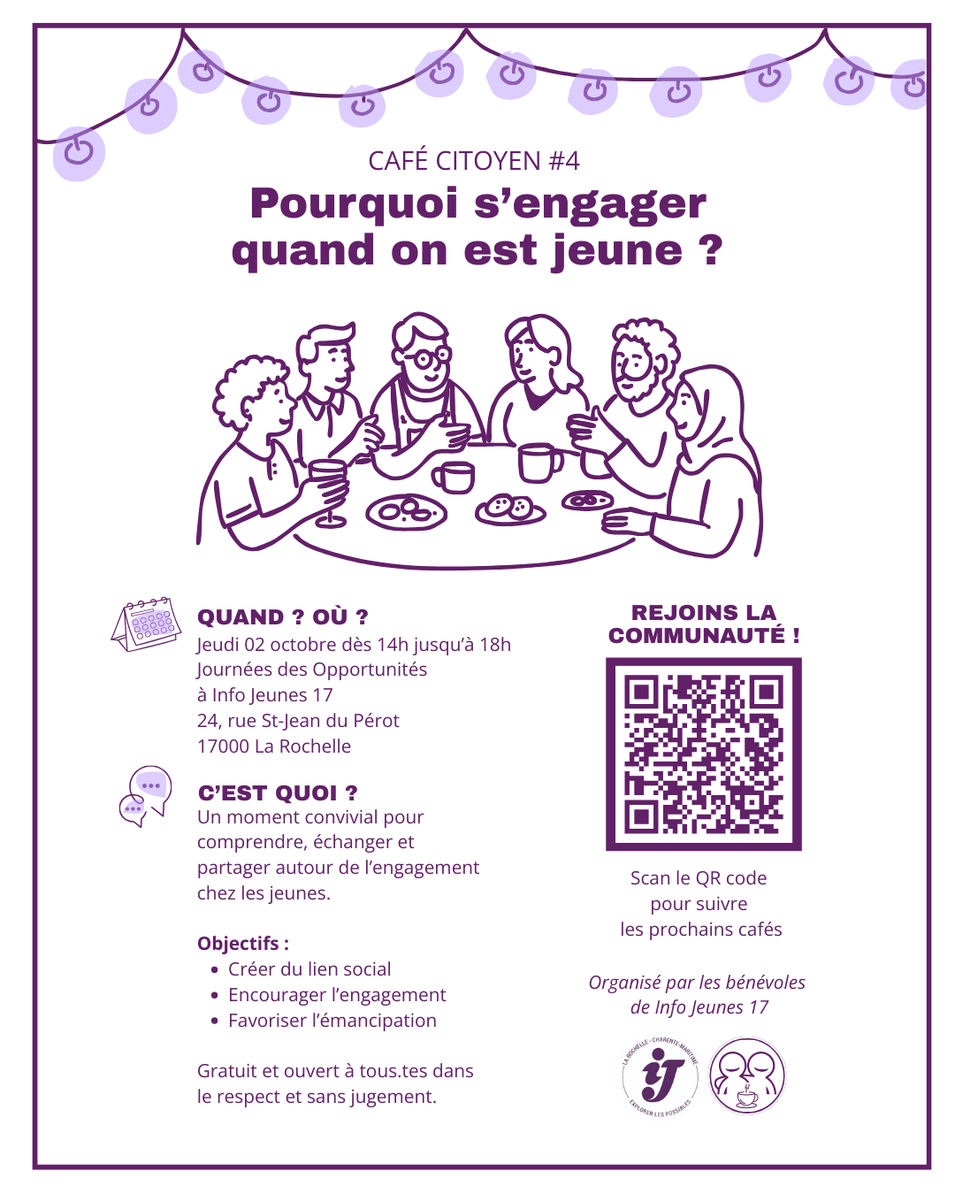 C’est quoi ? Un moment convivial pour discuter, comprendre et partager autour de la thématique de l'engagement jeune.
